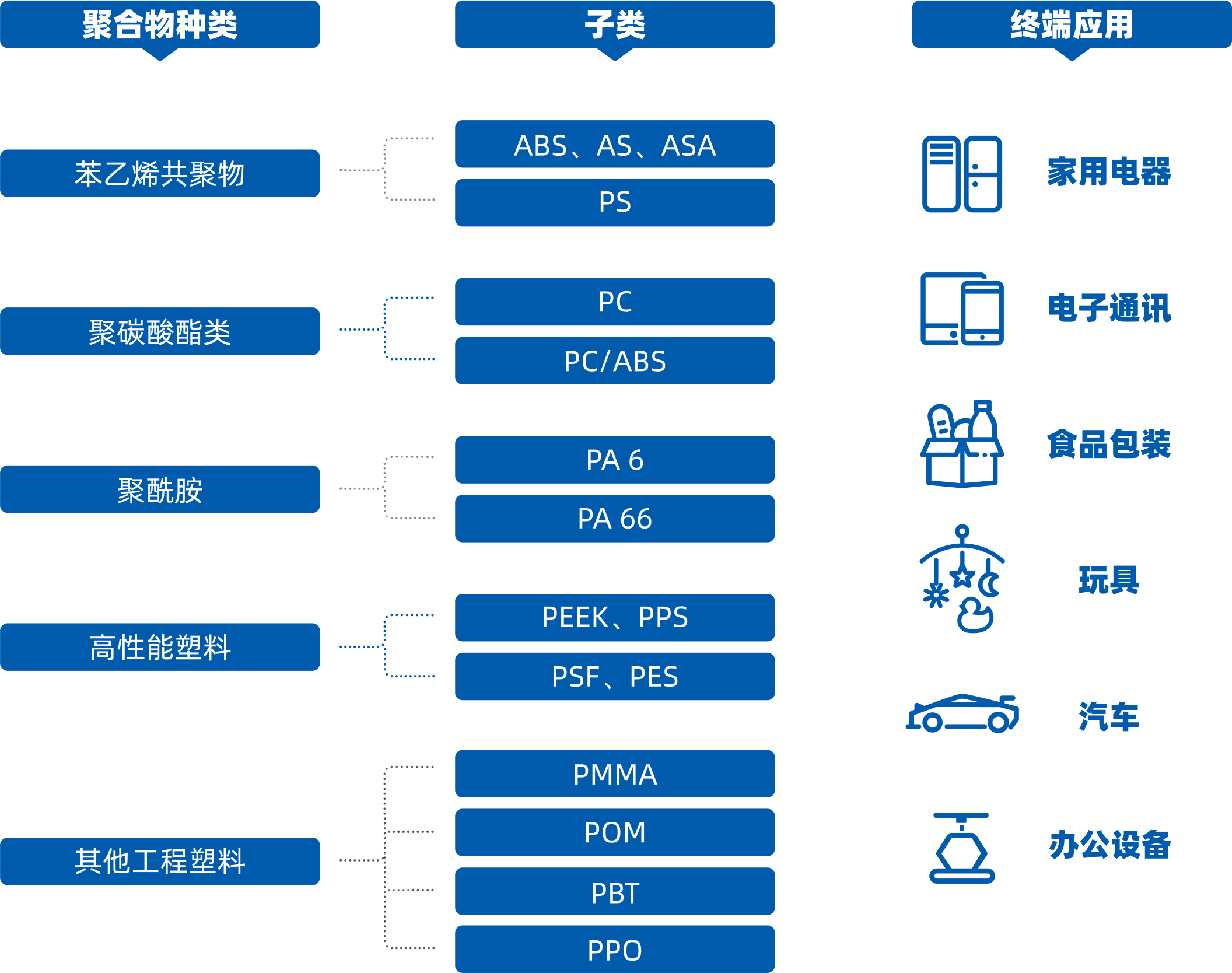 主營(yíng)產(chǎn)品:ABS、PS、PC、PA、PEEK、PPS等塑料原料,應(yīng)用于家電、電子電器、汽車、辦公設(shè)備等領(lǐng)域,與國(guó)內(nèi)外眾多大型生產(chǎn)商建立了長(zhǎng)期的戰(zhàn)略合作關(guān)系。